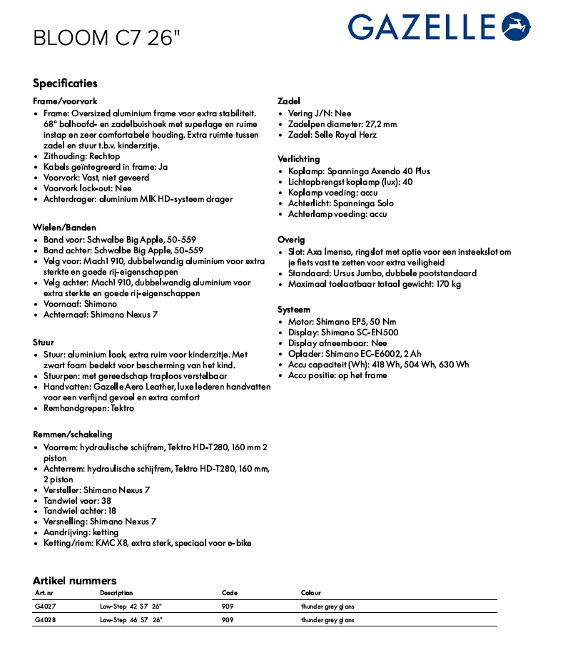 Met de Bloom C7 26" wordt fietsen met je kinderen en boodschappen doen een feestje. Op- en afstappen gaat gemakkelijk, dankzij de lage en ruime instap. Tussen het zadel en stuur is extra ruimte voor het voorzitje gemaakt. De plaatsing van de accu, in het midden van de fiets, zorgt voor meer stabiliteit en een betere wegligging. Wel zo veilig! Ook zonder zitje is deze e-bike de perfecte lifestylefiets.