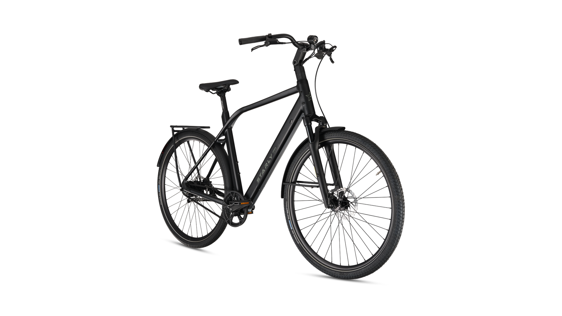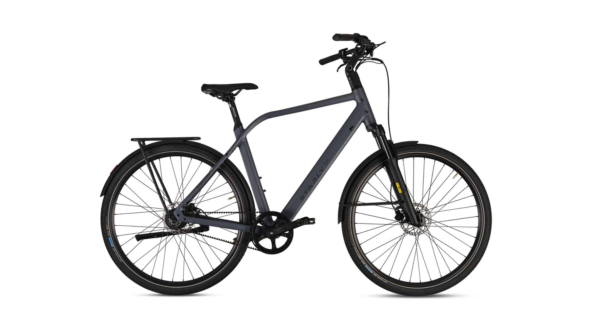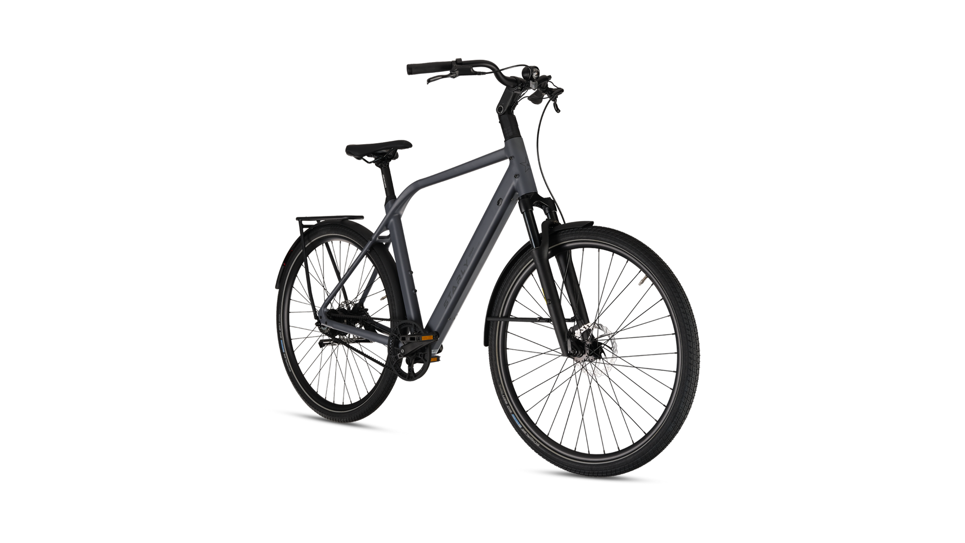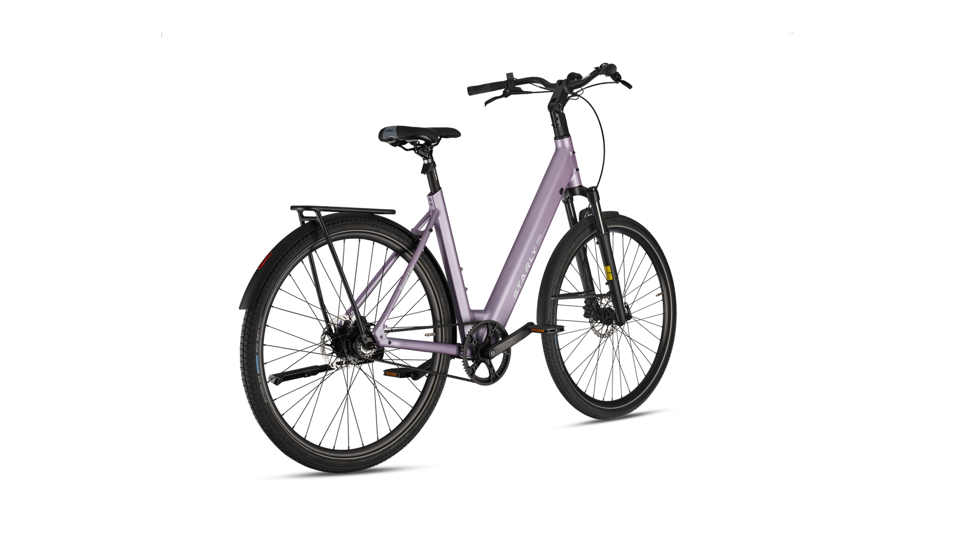 Met zijn stijlvolle design én slimme functionaliteit is deze e-bike perfect voor drukke dagen vol afspraken en snelle avonturen door de stad. Dankzij de brede, hoogwaardige Schwalbe Big Ben anti-lekbanden fiets je moeiteloos over tramrails, hobbelige wegen en zelfs zandpaden. De verende voorvork en verstelbare stuurpen zorgen voor een heerlijk comfortabele rit, elke dag opnieuw. En natuurlijk is de praktische achterdrager standaard inbegrepen – ideaal voor al je bagage onderweg. Met de Starly Bikes Super Lite wordt elke rit een feestje!